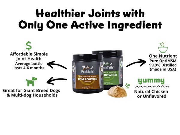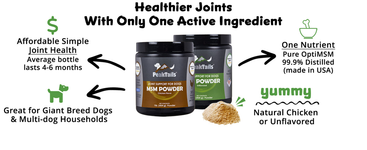 PeakTails MSM for dogs comes in a powder form that can be easily added to the daily food bowl. Simply mix it with a little bit of water to help it dissolve. Natural flavors help make it extra yummy.